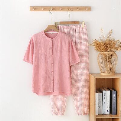 2重ガーゼ パジャマ レディース 夏 ガーゼ ルームウェア 半袖 トップス ロングパンツ 部屋着 セットアップ 2点セット 寝間着 前開き 無地 千鳥柄 春 夏 寝巻き 女性 上下セ