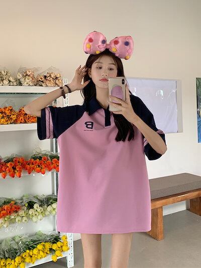 ぶつけ色ストライプポロシャツ半袖トップスレディースinsミディアム丈ゆったり韓国版シンプル開叉欧洲大判Tシャツ