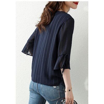 ブラウス レディース 40代 春夏秋新作 オシャレブラウス Vネックシフォンシャツ 五分袖トップス ストラップ柄ブラウス 大人 通勤 ゆったり シャツ30代 50代