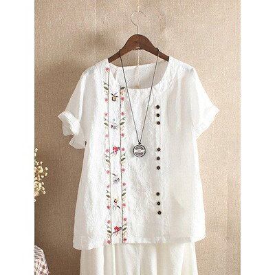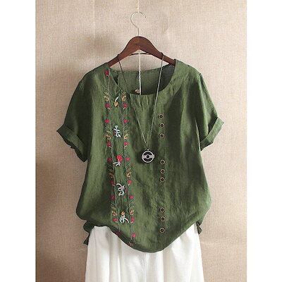 ブラウス シャツ レディース 綿麻混風 プルオーバー ブラウス トップス tシャツ カットソー コットンリネン おしゃれ 夏 ゆったり 刺繍 ママコーデ 30代 40代