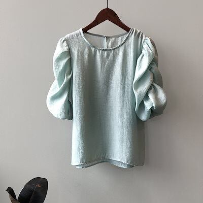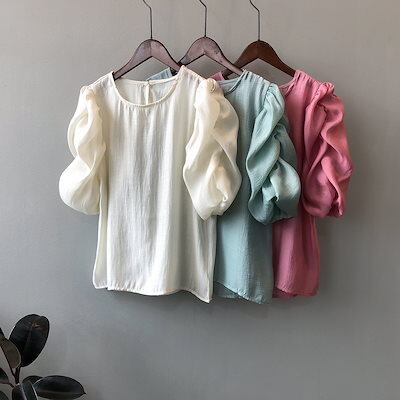 ブラウス 半袖 レディース プルオーバ ボリューム袖 クルーネック 透け感 無地 シフォン カワイイ