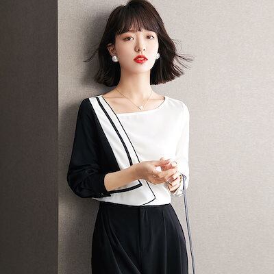 ブラウス レディース ノーカラー アシンメトリー ドッキング 配色 バイカラー デザイン カジュアル