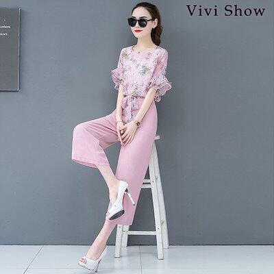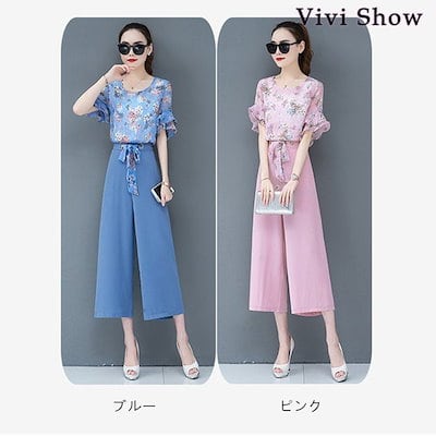 レディース セットアップ 2点セット 花柄 5分袖 ワイドパンツ ブラウス トップス リボン viv