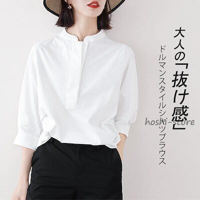 SNSの話題ドルマン ブラウス レディース トップス シャツ 七分袖 半袖 プルオーバー バンドカラー 前後差 スリット ホワイト 白 上品 着痩せ 通勤 オフィス 春夏
