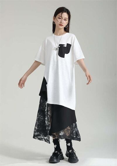変形デザインロンT Tシャツ レディース 春 夏 秋 半袖 綿100% カットソー トップス ロンT モード系 変形 アシンメトリー アシメ 無地 チュニック 変形Tシャツ ロング ヘムデザイン 個性