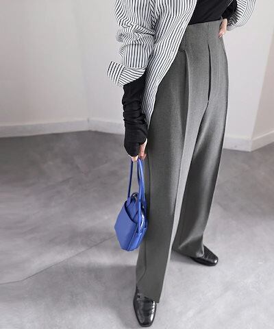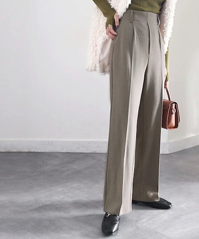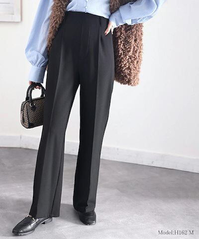 Classical Elfボトムス パンツ レディース 暖か 美脚 ウール調 セミフレア センター プレス スラックス 起毛 ウエスト 後ろ ゴム ゆったり すっきり 楽ちん ベルトループ 大きいサイズ 秋冬 グレー モカ