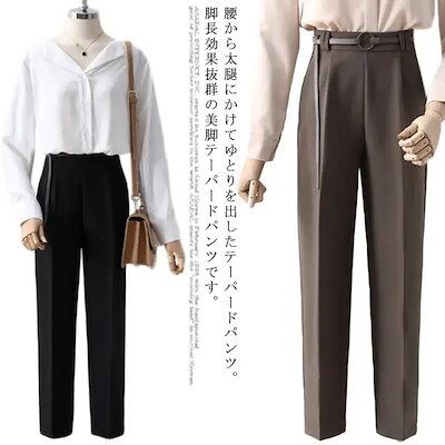テーパードパンツレディーススラックスパンツストレッチカジュアルパンツベルト付きボトムスズボン九分丈パンツハイウエストきれいめ無地細身通勤脚脚長効果体型カバー送料無