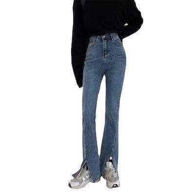 新商品!ハイウェストジーンズスリット入りフルレングスゆったり着痩せ効果ワイドパンツ脚長効果!スキニーパンツ スラックスパンツ