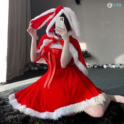 仕上げが細かいサンタコス レディース かわいい 兎の耳 マント付き ワンピース 猫耳 カシャ付き 手袋 サンタ 衣装 セクシー クリスマス セクシーコスプレ衣装 レディース