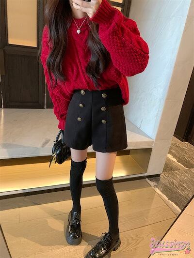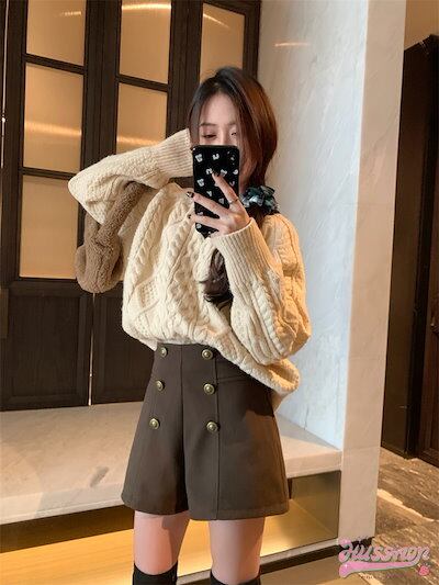 2024春夏パンツ ショート丈 ツイード ダブルボタン ハイウエスト 脚長効果 美脚効果 細見え 秋冬 黒 茶色 カジュアル 韓国ファッション レディース お出かけ