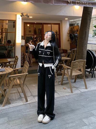 2024 秋 上下2点セット トップス お出かけ韓国 羽織り ショート丈フルラウンドヘムサイズ丈ボトムス ストレート系冬 ゆったりレディースシルエット スタイルアップワイドお出かけトラック
