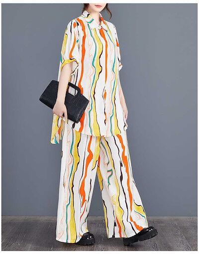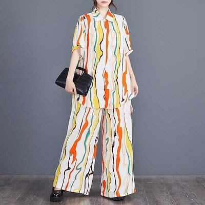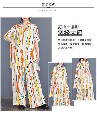 「ファットガール」 2024夏新品 上下セット ロングシャツ+ワイドパンツ 大きいサイズ 体型カバー レディース セットアップ メガ割