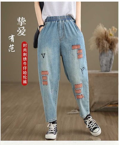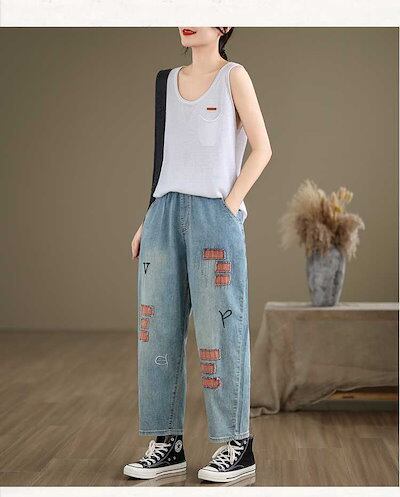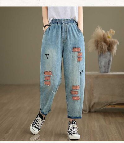 「ファットガール」 夏 薄手 ジーンズ 刺繍柄 デニムパンツ ゴム 八文丈 レディース ワイドパンツ スラックス 体型カバー 大きいサイズ ゆったり