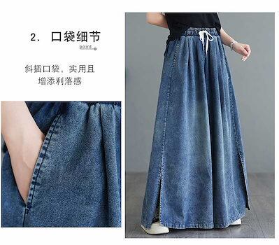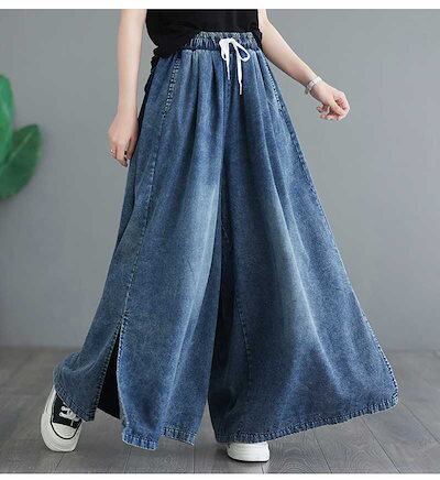 「ファットガール」 デニム ワイドパンツ キュロットスカート スリット ゴム ハイウエスト 体型カバー 大きいサイズ ゆったり レディース
