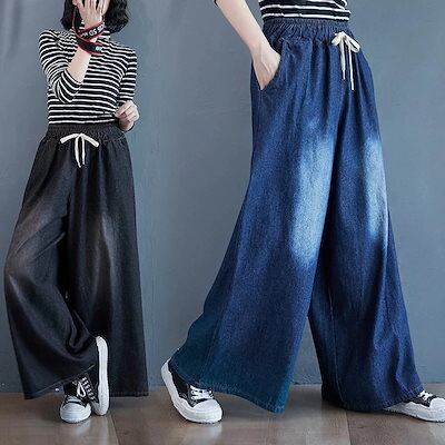 「ファットガール」 秋冬 デニムパンツ ゴム ワイドパンツ ハイウエスト 大きいサイズ ゆったり フレア レディース ロングパンツ