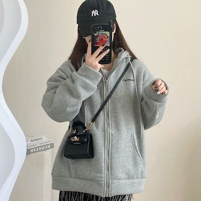 パーカーレディーススウェット秋冬ゆったり裏起毛厚手保温フード付きコートベルベット韓国ファッションゆるいジッパー付きカーディガン