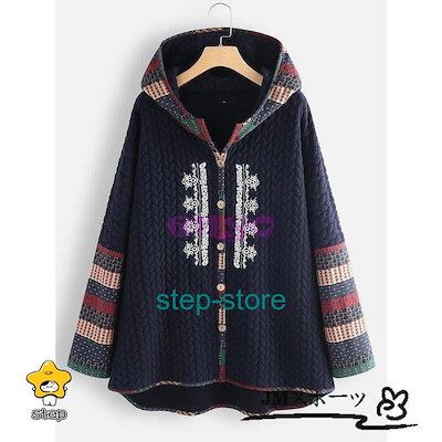 コート厚トップスロングコートフードトップスレディースチュニックミディアム丈長袖フード柄ボーダー柄冬パーカー体型カバー防寒秋40