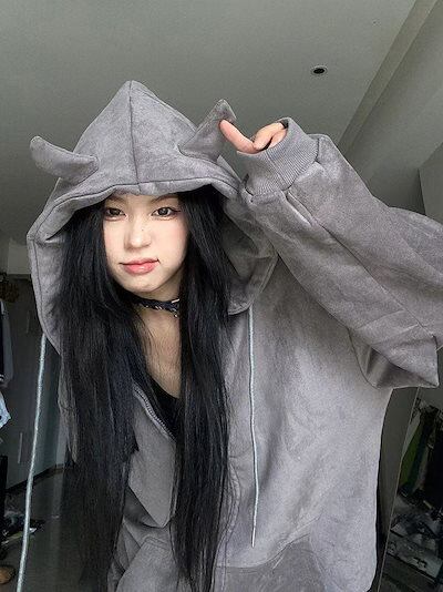 小悪魔 ビッグシルエット パーカー 暗黒 病み系 韓国ファッション 可愛いフード付き 秋冬服 レディース
