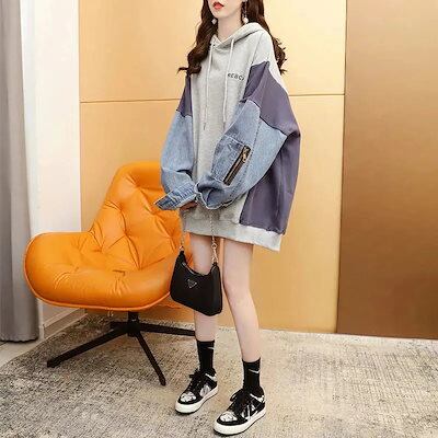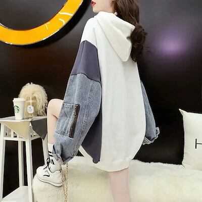 2024 秋 新 パーカー 切り替え デニム フェイクレイヤード スウエット セミロング トップス レディース 春 秋 韓国ファッション