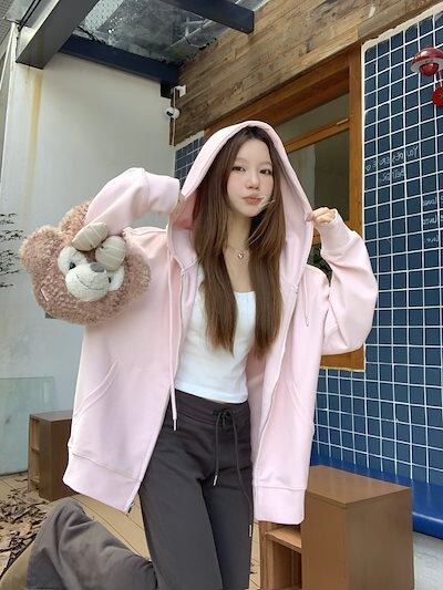2024 秋冬トップスかわいいパーカー フード付き韓国風長袖ゆったり細見え白黒おしゃれレトロチャッシルエット甘め大人っぽ韓国フルサイズファッション系ルーズレディースサイドお出かけ学生通学トラック羽織り