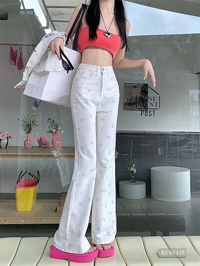 パンツ デニム ジーンズ ロング丈 裾広がり ワイド ハイウエスト 脚長効果 美脚効果 細見え 夏 カジュアル かわいい ゆったり 白 花柄 韓国ファッション レディース お出かけ