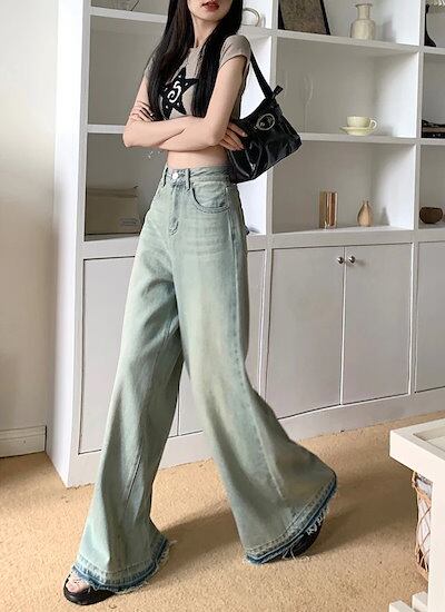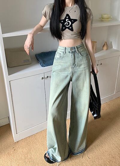 ボトムス レディース ハイウエスト ウォッシュ加工 ワイドデニム ジーンズ ワイドパンツ バギーパンツ スタイルアップ 脚長 美脚 カジュアル かっこいい クール 韓国