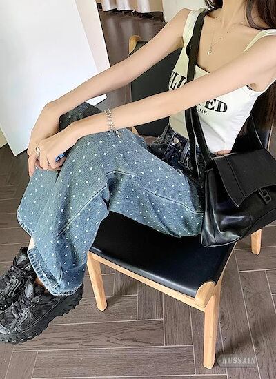 ボトムス レディース ハイウエスト ドット柄 ワイドデニム ワイドレッグジーンズ ジーンズ デニム 水玉 カジュアル 可愛い おしゃれ スタイルアップ 脚長 美脚 韓国