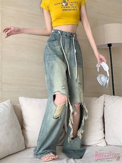 パンツ デニム ジーンズ ロング丈 モップパンツ ダメージ加工 ワイド ストレート 夏 カジュアル ストリート 韓国ファッション レディース お出かけ