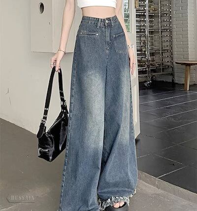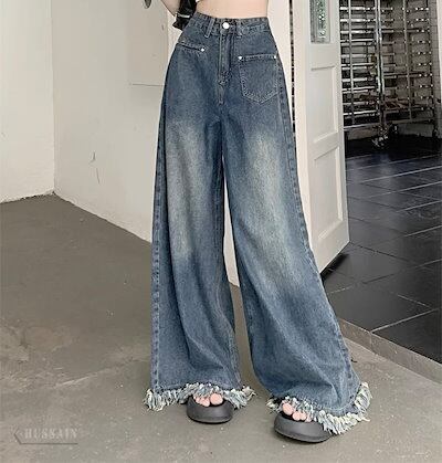 パンツ デニム ジーンズ モップパンツ ロング丈 レッグワイド フリンジ ハイウエスト 脚長効果 美脚効果 細見え 夏 カジュアル 韓国ファッション レディース お出かけ
