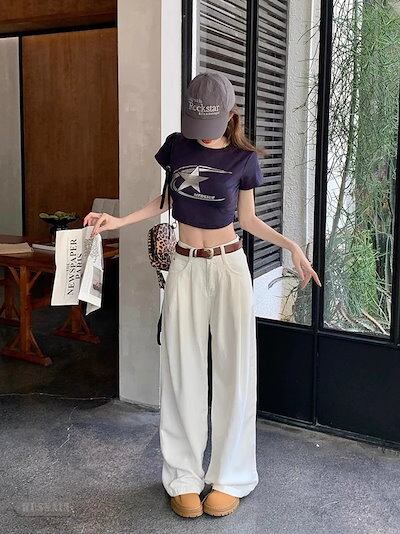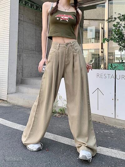 ボトムス レディース ハイウエスト ワイドパンツ ワイドレッグパンツ ホワイト 白 カーキ ルーズ カジュアル ストリート 脚長 美脚 スタイルアップ ゆったり 夏 韓国