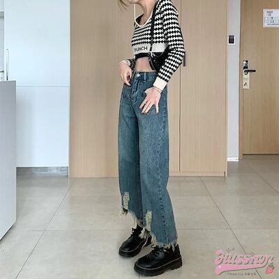 パンツ デニム ダメージ加工 ワイドレッグパンツ ハイウエスト ストレート カジュアル シンプル 秋 お出かけ 休日 レディース ファッション