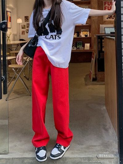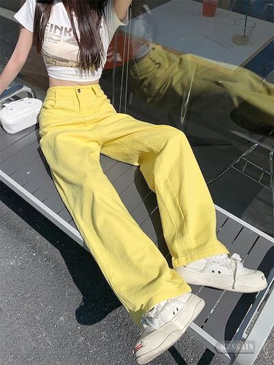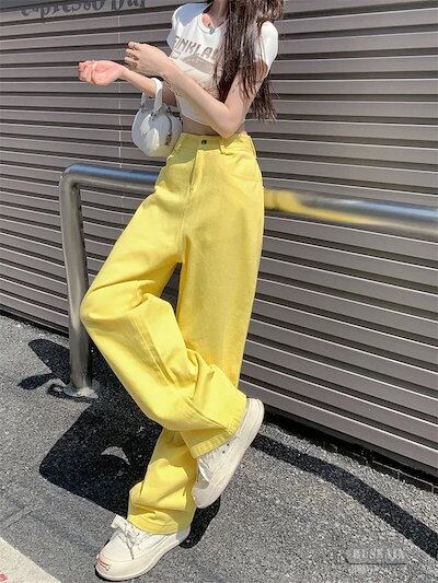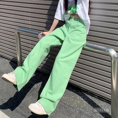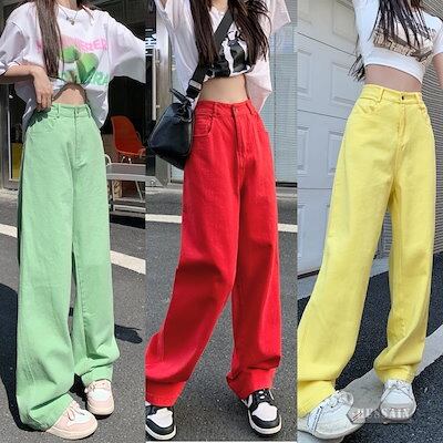 パンツ デニム ジーンズ カラーパンツ ロング丈 ワイド ストレート ハイウエスト 脚長効果 美脚効果 細見え 夏 カジュアル ストリート 韓国ファッション レディース お出かけ