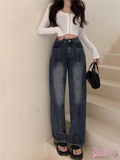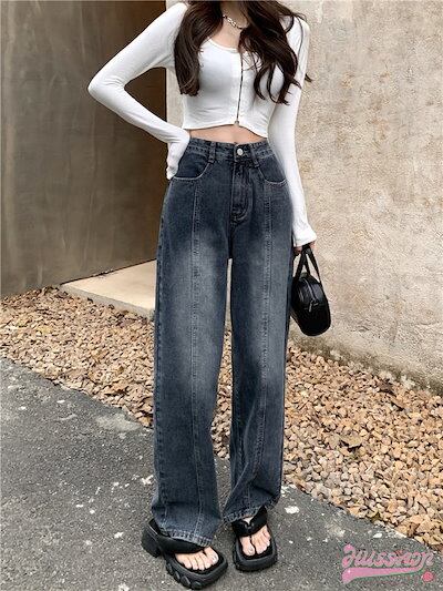 パンツ デニム ジーンズ ロング丈 ワイド ストレート ゆったり ハイウエスト 脚長効果 美脚効果 細見え 秋 カジュアル ストリート ウォッシュ加工 韓国ファッション レディース お出かけ