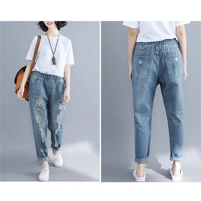 ジーンズ レディース デニム ワイド クラッシュ 9分丈 ボーイフレンドデニム 体型カバー パンツ 穴開き 美脚 大きいサイズ 春 夏 秋