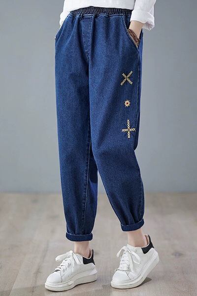 ジーンズレディース春服韓国ファッション可愛い刺繍ハイウエストワイドパンツ肉を隠す着痩せ効果ゆったり通気性