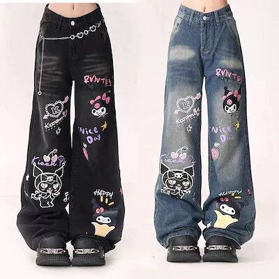 クロミちゃんジーンズ レディース ジーパン ハイウエストハローキティデニム ズボン パンツ デニムパンツ ワイドパンツ ダメージジーンズ