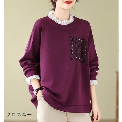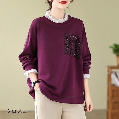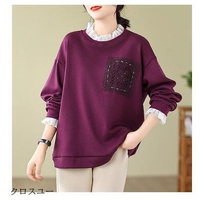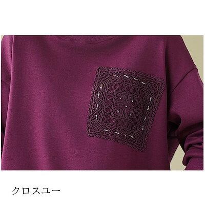 プルオーバー レディース 秋冬トップス カットソー 長袖 クルーネック あたたかな裏起毛 柔らかくソフトな風合い 襟口袖口 白いレース ハイネック 大