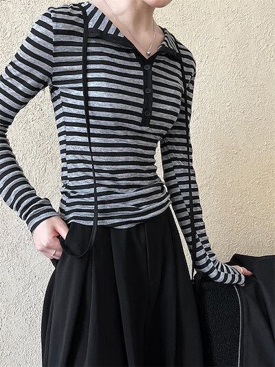 ストライプ パーカー 長袖 tシャツ パーカーtシャツ フーディー カットソー レディース スウェット 秋 冬 春 tシャツ レディース タイトシルエット フード付き シンプル タイト トップス ボー