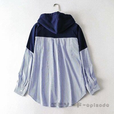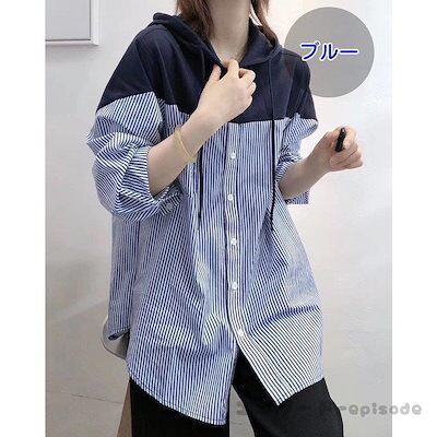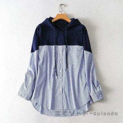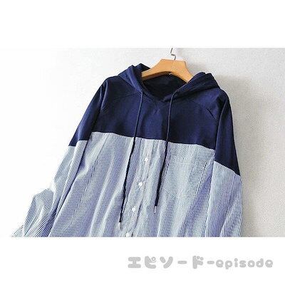 パーカー レディース ブラウス 40代 春夏 韓国風 プルオーバー 切り替え 長袖 可愛い シャツ ストライプ柄 大きいサイズ フード付き 20代 30代 おしゃれ
