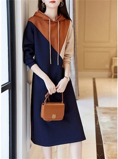 パーカーワンピース レディース 春 秋 長袖 きれいめ フード付き ワンピース バイカラー スウェット 膝丈 切り替え マルチカラー カジュアル ゆったり ロング丈 切り替えワンピース 体型カバー 春