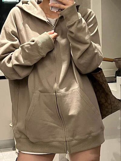 ジップアップ パーカー ジャケット レディース トップス アウター 上着 羽織 丈長 長袖 ドロップショルダー フード ファスナー ポケット 前開き 裏起毛 綿 かわいい 大人可愛い シンプル カジュ