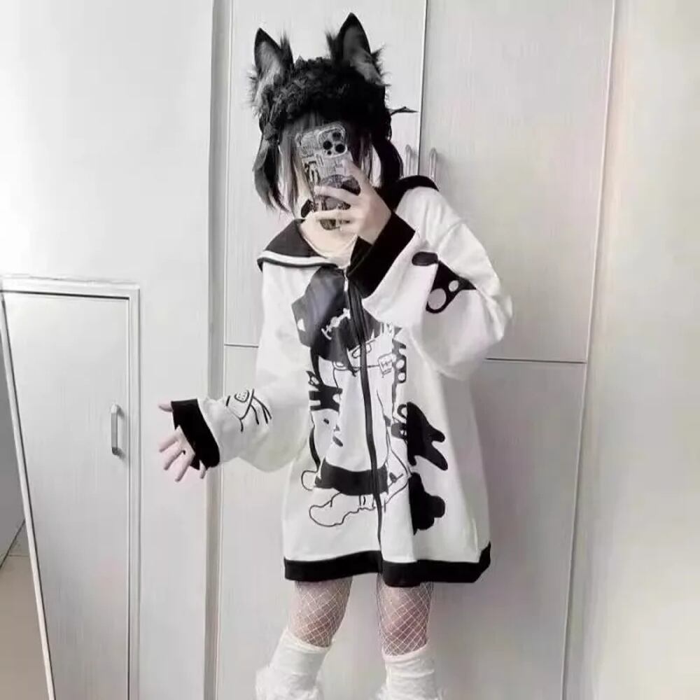 女性用の薄い日本のネイビーカラーのパーカー、ジッパー付きのゆったりとしたコート、カジュアルなサブカルチャー、女の子用のかわいいアニメスウェットシャツ、原宿、y2k、春 パーカー ジャージ y2k T240908201319_03