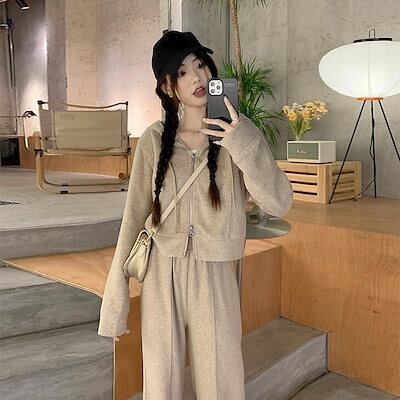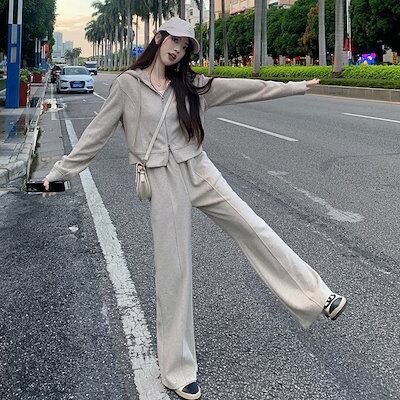 韓国ファッション レディース セットアップ フード付きショートカジュアルロングスリーブスウェットジャケットワイドパンツファッションスーツ