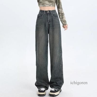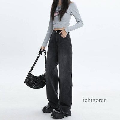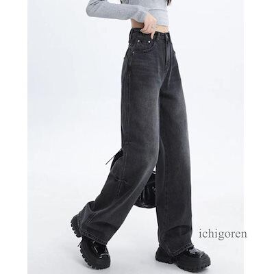 デニム ズボン ジーパン ワイドパンツ ストレート シンプル レディース 黒 韓国ファッション ゆったり ストリート バギー 着回し 太め 流行り
