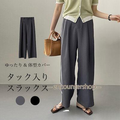 ス レディース タックパンツ 薄手 スーツパンツ ゆったり 夏 春 ワイドパンツ バギーパンツ スーツ生地 タック入り ロングパンツ 体型カバー